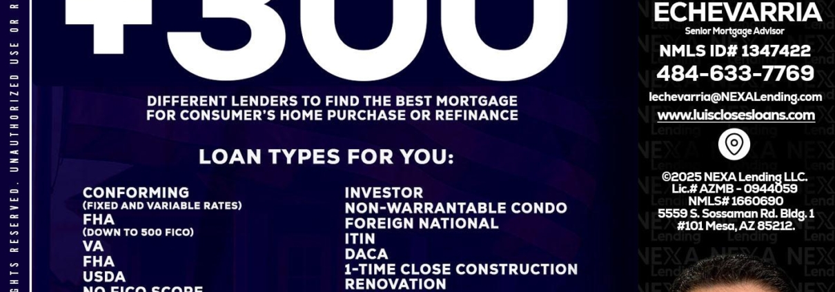 Hi, my name is Luis Echevarria. I’m a Loan Officer with NEXA Lending LLC., offering personalized mortgage solutions, fast customized quotes, great rates and service with integrity.