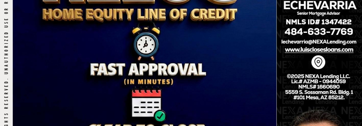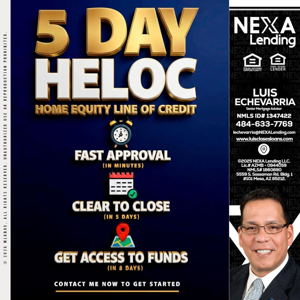 5 day hello - Luis Echevarria -Broker/Senior Mortgage AdvisorHi, my name is Luis Echevarria. I’m a Loan Officer with NEXA Lending LLC., offering personalized mortgage solutions, fast customized quotes, great rates and service with integrity.