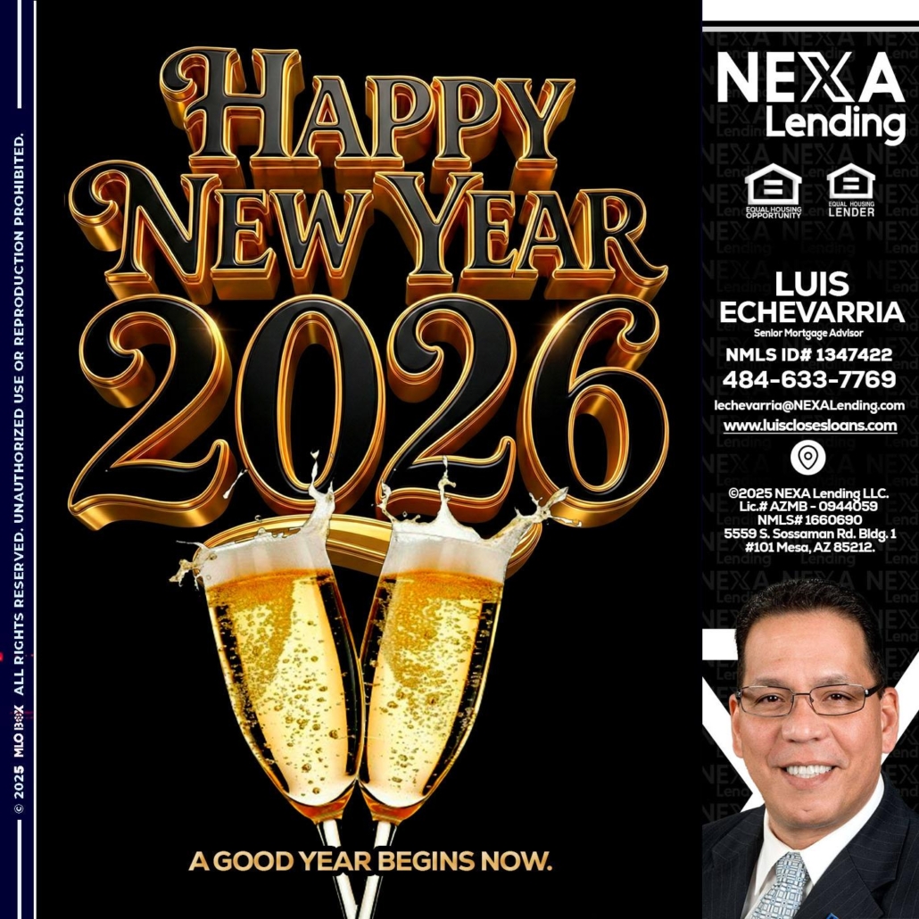 happy new year 2026 - Luis Echevarria -Broker/Senior Mortgage AdvisorHi, my name is Luis Echevarria. I’m a Loan Officer with NEXA Lending LLC., offering personalized mortgage solutions, fast customized quotes, great rates and service with integrity.