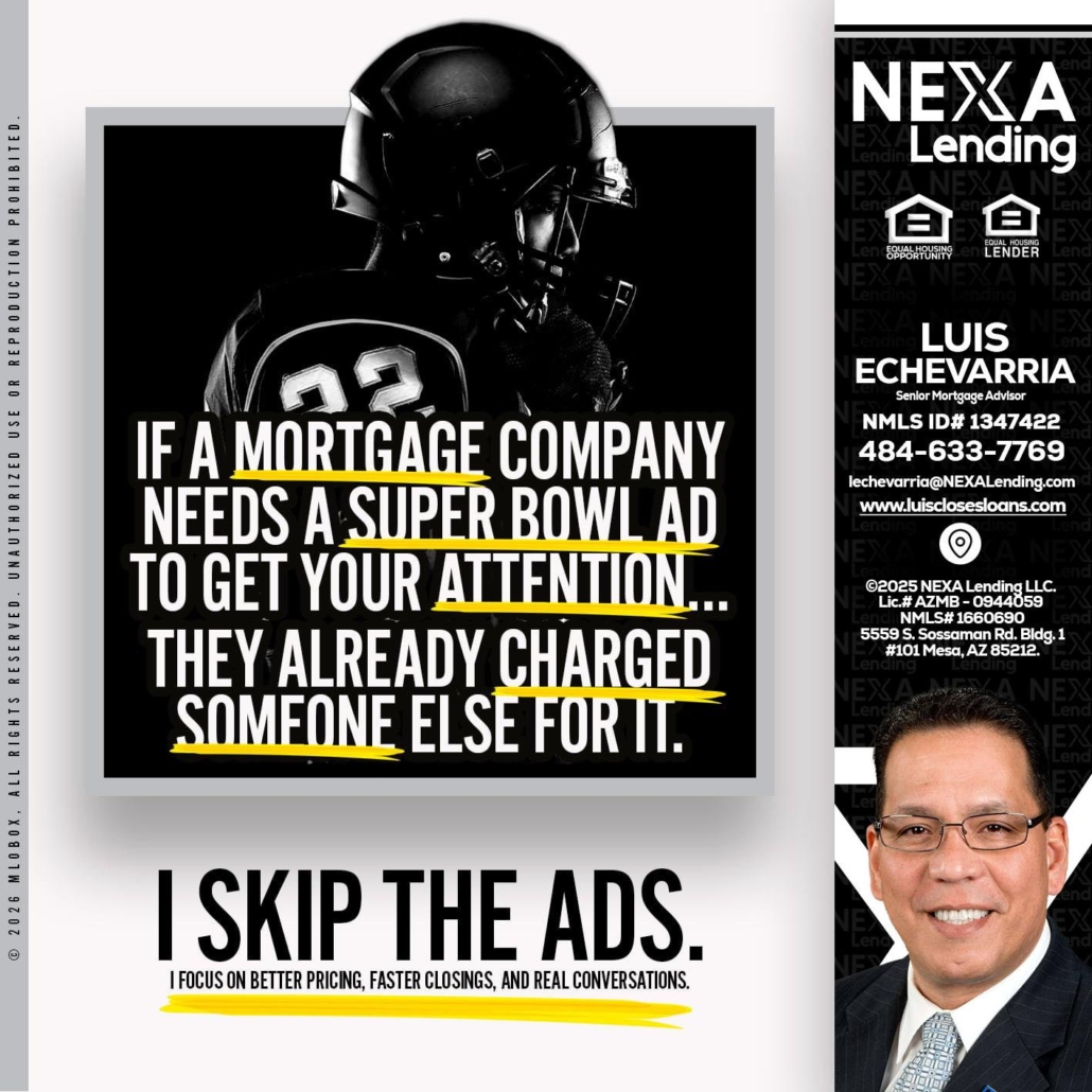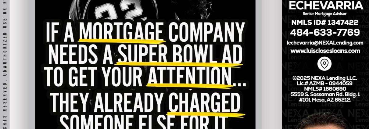 if a mortgage ad - Luis Echevarria -Broker/Senior Mortgage AdvisorHi, my name is Luis Echevarria. I’m a Loan Officer with NEXA Lending LLC., offering personalized mortgage solutions, fast customized quotes, great rates and service with integrity.